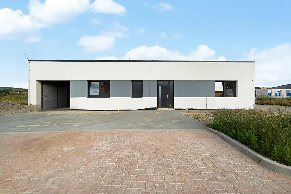 Vytápění domu je zajištěno teplovodním podlahovým topením (systémová deska) s tepelným čerpadlem. Dešťová voda je svedena do retenční nádrže (6 m) s vsakovacím systémem. Prostorná garáž (33 m2) disponuje průchodem na zahradu.