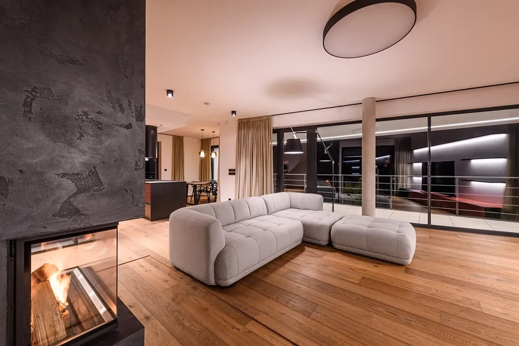Celou budovu lemují terasy s designovým večerním osvětlením navazující na obytný prostor.