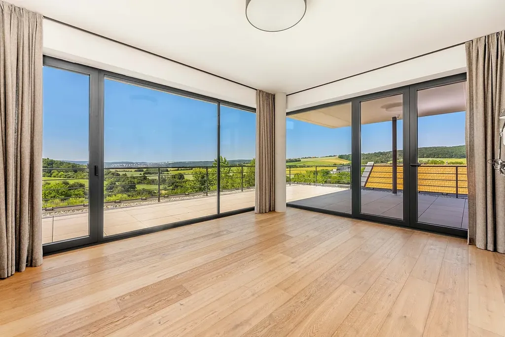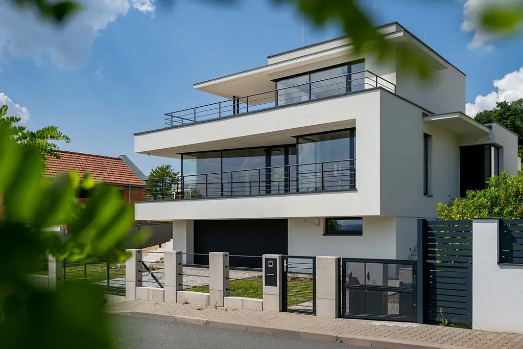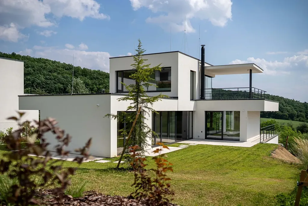 Novostavba vily je citlivě umístěna v mírně svažitém terénu pozemku s překrásnými panoramatickými výhledy do okolní krajiny.