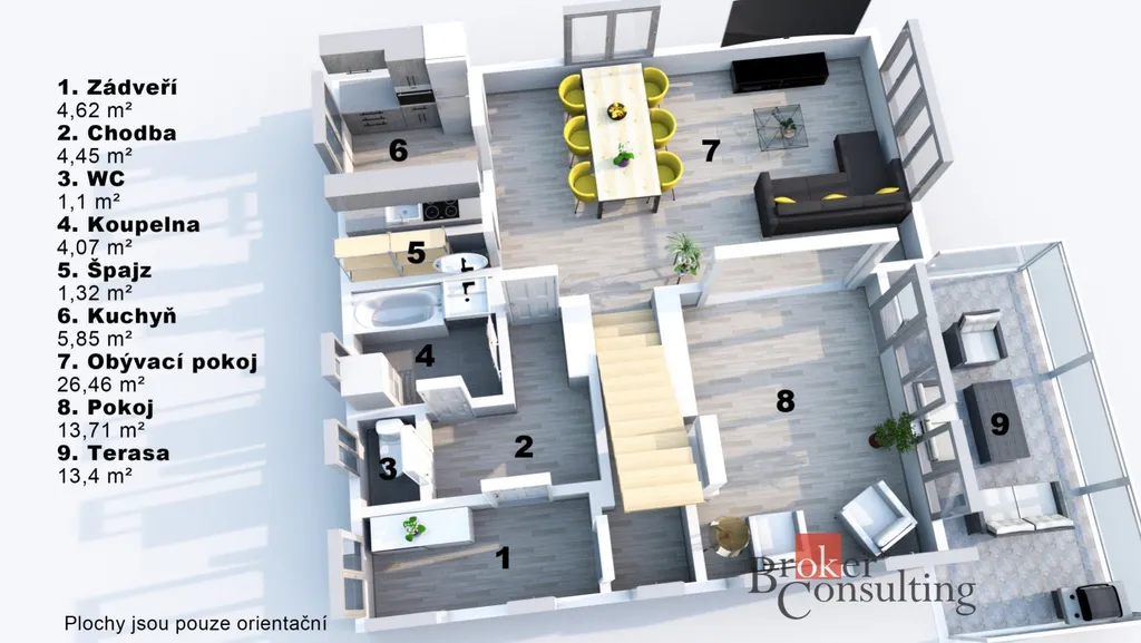 Podlaha je vyhřívána podlahovými rohožemi v koupelně, kuchyni a jídelně.
