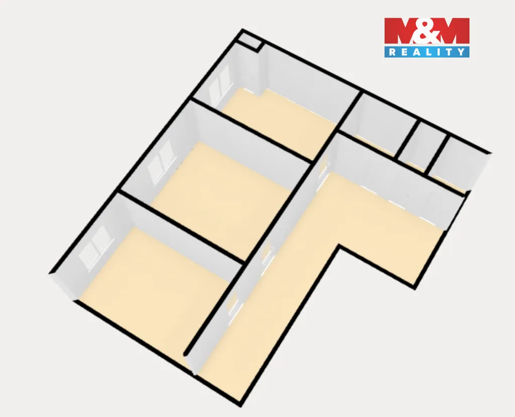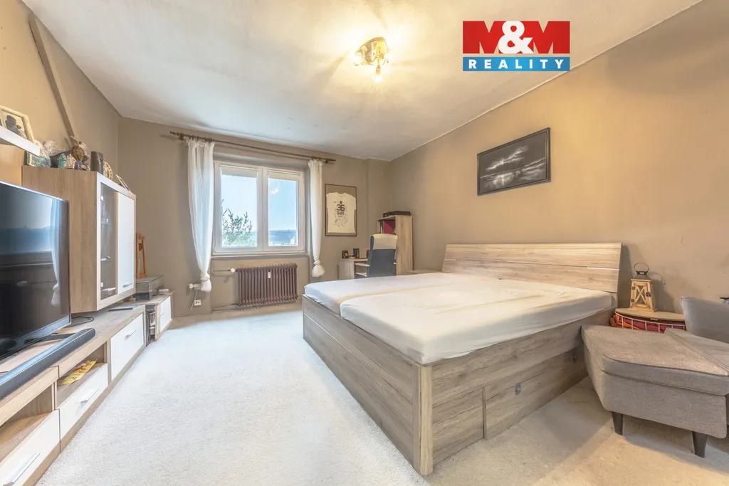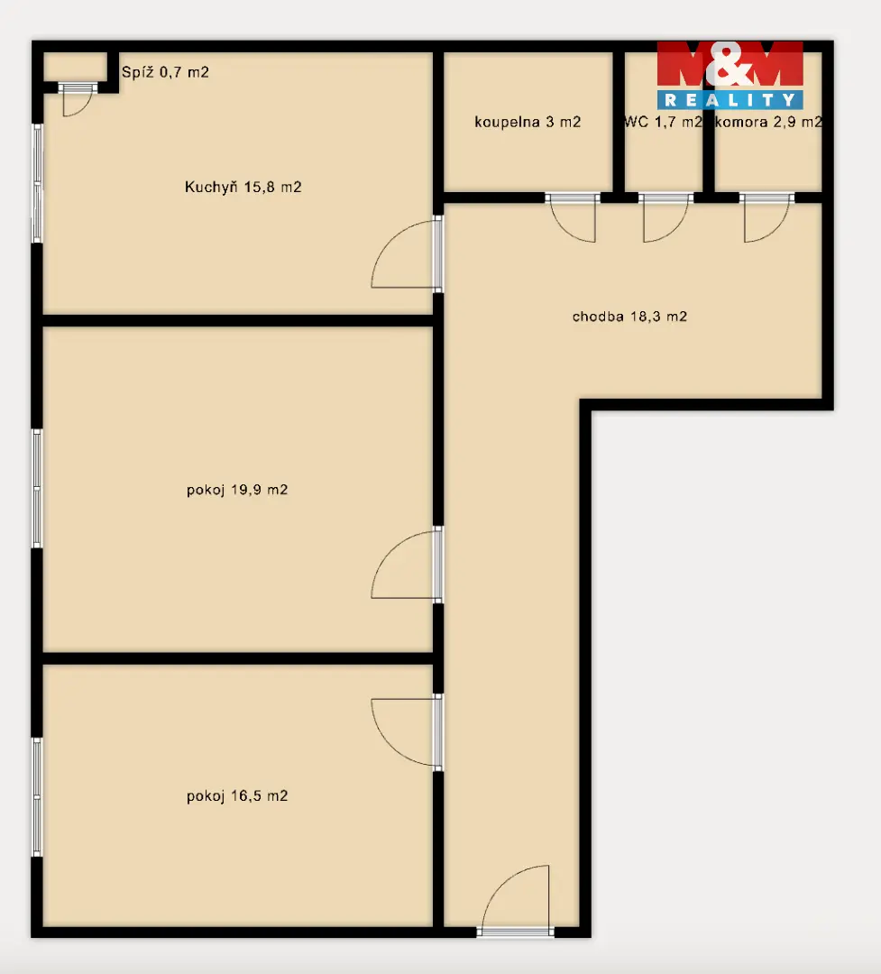 Dispozici tvoří dětský pokoj (16,5 m²), ložnice (19,9 m²), kuchyň s jídelním koutem (15,8 m²) a spíží (0,7 m²), prostorná chodba (18,3 m²), koupelna (3 m²), samostatné WC (1,3 m²) a komora (2,9 m²). K bytu náleží také sklep.