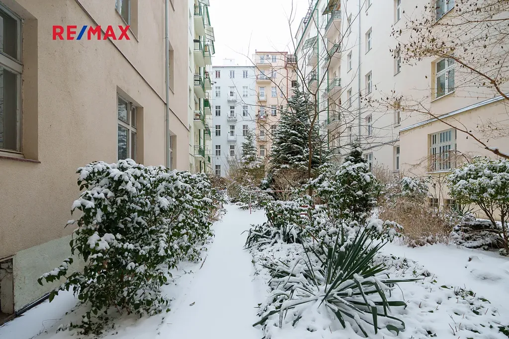 Posedět můžete na dvorečku vnitrobloku, který je volně přístupný všem obyvatelům domu.