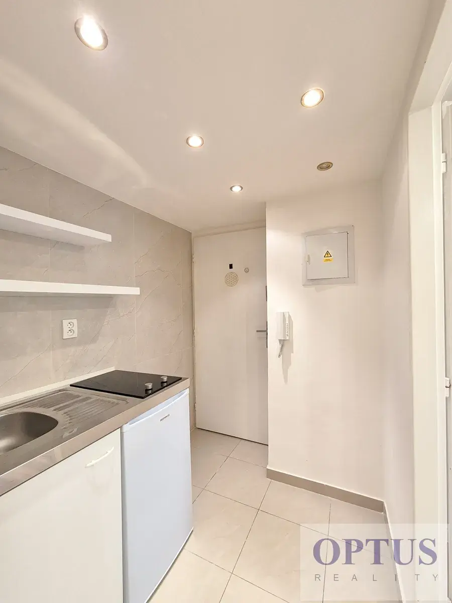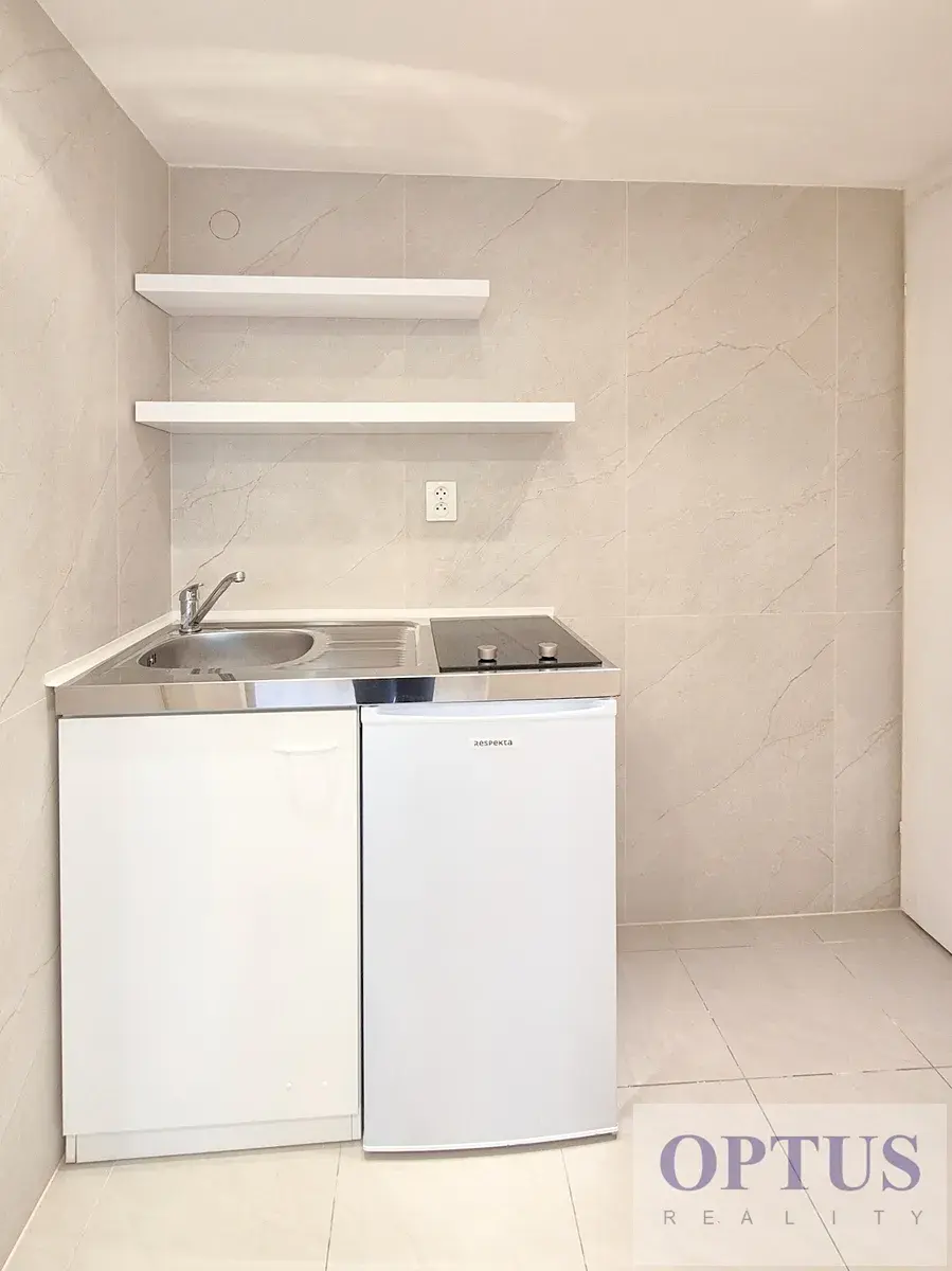 Další vybavení: kuchyňská linka s elektrickou dvojplotýnkou a lednicí, dále pračka, žaluzie na okně v koupelně, kolejnice pro záclony / závěsy v pokoji, vinylové podlahy a dlažba, elektrické vytápění – přímotopy, internetové připojení je možné přes Wi-Fi (5G).