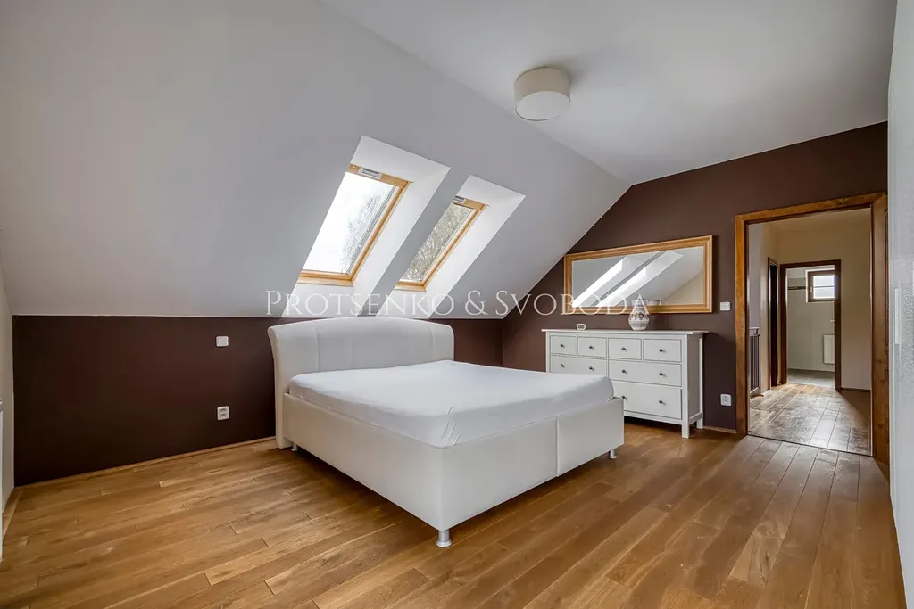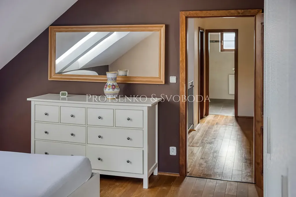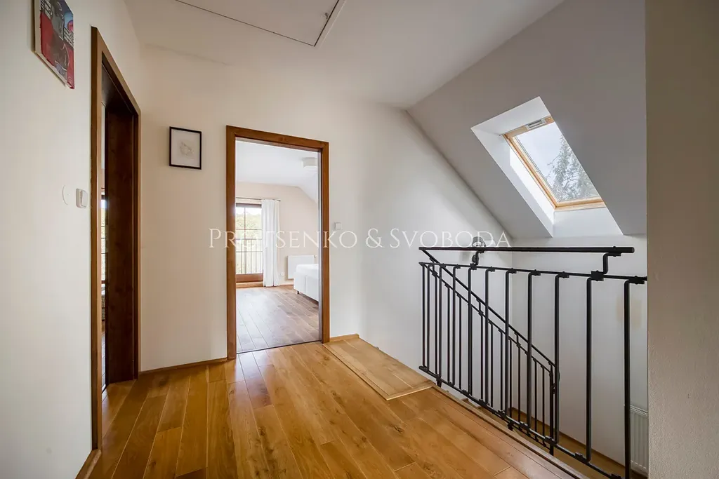 - V patře se nachází tři ložnice, prostorná koupelna s vanou a sprchovým koutem a komora.