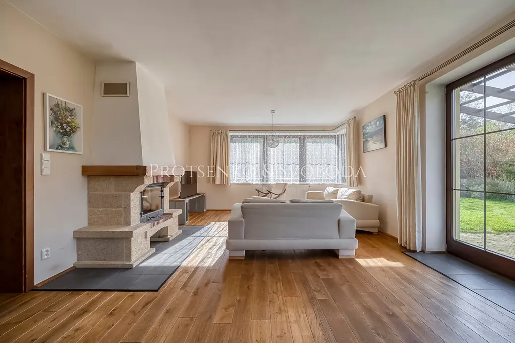 - Přízemí tvoří prostorný obývací pokoj s krbem, propojený s jídelnou a kuchyní s přímým vstupem na zahradu a terasové posezení.