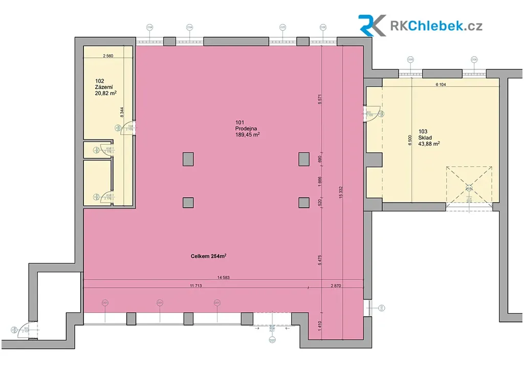 Celková výměra prostoru činí 254 m², z toho cca 44 m² sklad a cca 21 m² zázemí.