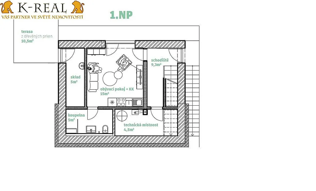 První podlaží je navrženo jako samostatná bytová jednotka 1+kk, kterou lze přizpůsobit vašim požadavkům. Součástí vybavení je podlahové topení s plynovým zdrojem, které zajišťuje komfortní teplo po celý rok. Elektroinstalace je připravena pro dobíjení elektromobilů a instalaci fotovoltaické elektrárny. Exteriér domu nabízí letní terasu ideální pro odpočinek, příruční sklad a dvě parkovací místa