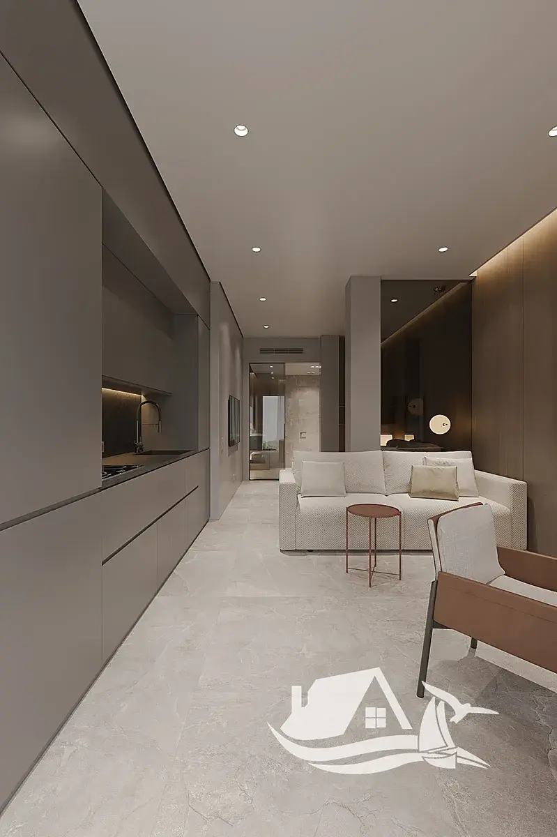 Interiéry kladou důraz na praktičnost a pohodlí, každý apartmán disponuje jednou ložnicí a jednou koupelnou, což vytvoří útulné a snadno udržovatelné zázemí. Kvalitní podlahy z porcelánové dlažby dodávají prostoru eleganci, elektrické rolety a klimatizace zajišťují komfort po celý rok a vestavěné skříně nabízejí dostatek úložného prostoru pro pořádek a organizaci. Promyšlená dispozice maximalizuje využití dostupné plochy, takže se interiéry cítí vzdušné i praktické zároveň.
