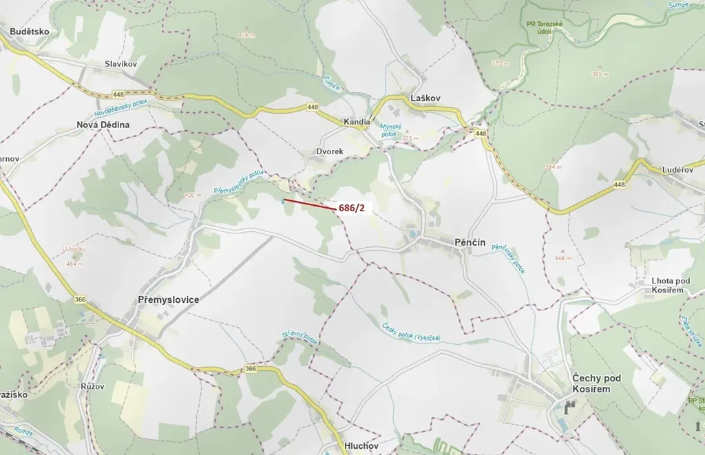 Lesní pozemek o výměře 1381 m2, parcelní číslo 686/2, podíl 1/1, katastrální území Přemyslovice, obec Přemyslovice, obec s rozšířenou působností Prostějov, okres Prostějov, Olomoucký kraj. Po těžbě.