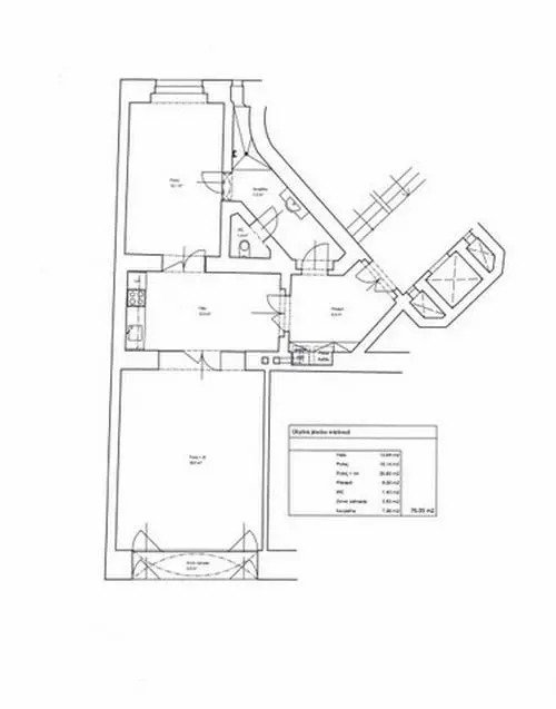 Prostory se nachází v 1.patře s výtahem. Celková plocha činí 76 m2 a sestává ze předsíně, haly s kuch. koutem, 2 místností (větší disponuje navíc zimní zahradou), koupelny a WC. Na podlaze je teraco.
