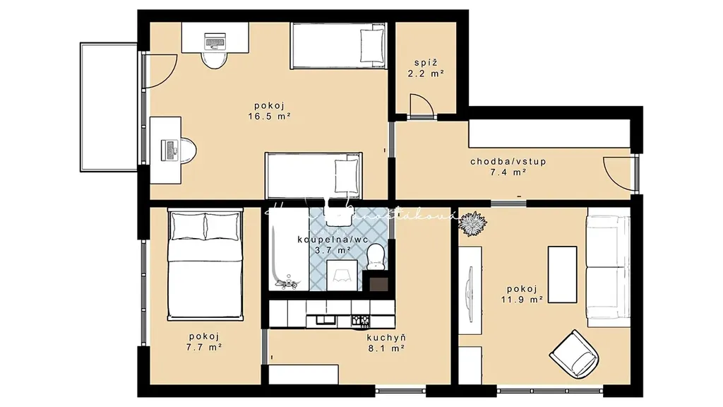 Dispozice bytu je 3+1. Ložnice a dětský pokoj s balkonem jsou orientovány na východ, obývací pokoj a kuchyň na sever. V chodbě jsou nápaditě vyřešeny úložné prostory, navíc je zde komora. K bytu náleží sklep.