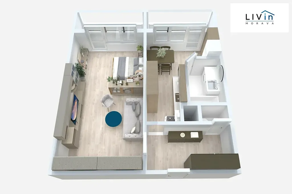 Byt je dispozičně složen z předsíně (5,78 m²), jednoho obytného pokoje (22,77 m²), kuchyně s jídelním koutem (12,46 m²), koupelny s rohovou vanou (2,56 m²) a samostatného WC (0,97 m²). K bytu náleží dvě lodžie o celkové ploše cca 7,86 m² a sklepní kóje o výměře 2,66 m². V domě je k dispozici společná kolárna a kočárkárna.