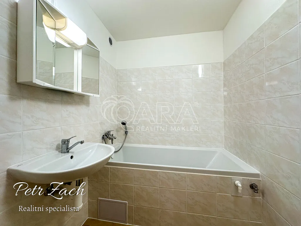 Koupelna je vybavena vanou, což přispívá k pohodlí každodenního používání. Kuchyně je zařízena včetně trouby a ledničky, navíc disponuje praktickou špajzkou, která se nachází vedle lednice. Na chodbě se nachází velká vestavná skříň pro uskladnění osobních věcí. Byt dále nabízí lodžii, kde si můžete užít chvíle odpočinku na čerstvém vzduchu, a sklepní kóji pro další uskladnění věcí.