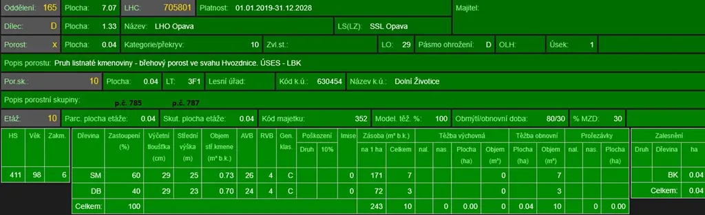 - p.č. 785 vedená jako lesní pozemek o celkové výměře 127 m2 (stáří lesa 105 let - zastoupení dřevin smrk, dub),