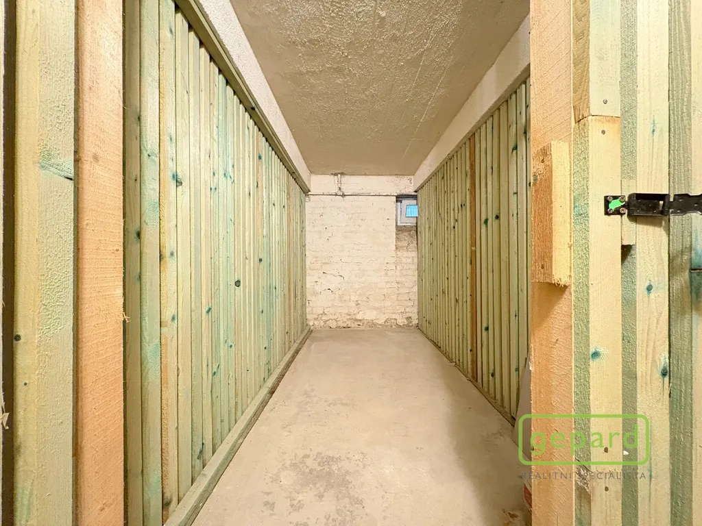 Dispozice bytu zahrnuje vstupní chodbu, samostatné WC, koupelnu s vanou, komoru, prostornou kuchyni, ve které je dostatek místa i pro jídelní kout nebo pracovní místo, a samostatný pokoj o výměře přes 20 m². K bytu náleží nadstandardní sklep o výměře více než 4 m².