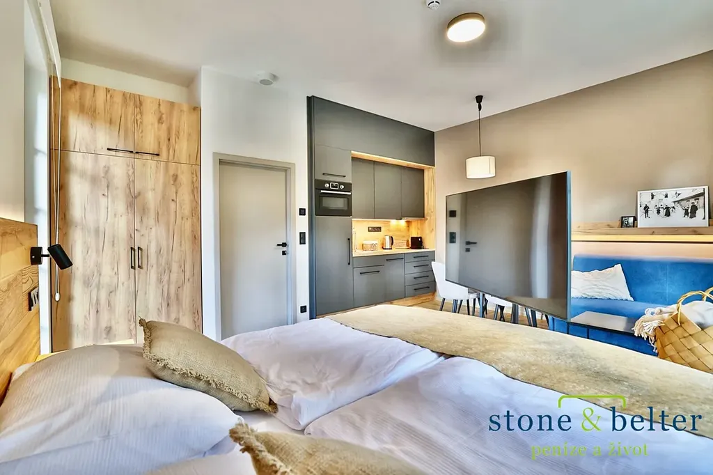 Interiér je vybaven moderní kuchyňskou linkou včetně kvalitních spotřebičů, jako jsou varná deska, trouba, myčka, lednice a kávovar. Dřevěné podlahy a nábytek na míru dodávají apartmánu příjemnou atmosféru, přičemž je nabízen kompletně vybavený a připravený k okamžitému užívání nebo pronájmu.