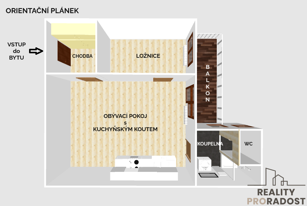 Dispozičně byt nabízí vstupní chodbu s vestavěnými skříněmi (4,61 m2), prostorný obývací pokoj s kuchyňským koutem (28,1 m2), z kterého je vstup do ložnice (8,7 m2), na balkon (5,1 m2) a do koupelny se sprchovým koutem, ze které je přístupné WC (1,12 m2) – viz orientační plánek.