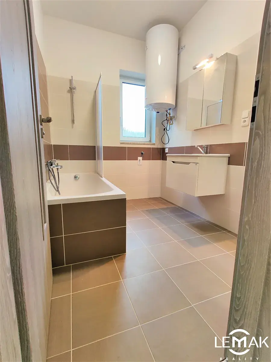 V zastoupení majitele nabízíme k dlouhodobému pronájmu byt o dispozici 3+kk a podlahové ploše 64 m² v novostavbě BD v obci Těšetice. Samotný byt sestává ze vstupní chodby, 2 neprůchozích pokojů, obývacího pokoje s kuchyňským koutem ( kombinovaná lednice, indukční varná deska, horkovzdušná trouba, myčka nádobí ), koupelny s vanou a samostatné toalety. Vytápění bytu zajišťuje elektrokotel napojený na teplovodní podlahové vytápění. Vstupní dveře do bytu jsou bezpečnostní a protipožární, podlahy kryje PVC, v koupelně a na toaletě keramická dlažba. K bytu náleží uzamykatelná kóje o výměře 7 m², parkovací stání pro automobil, společná terasa se zahrádkou a další společné prostory. Vytápění bytu zajišťuje elektrokotel, ohřev vody je el. bojlerem. Jsou zde nízké náklady na bydlení. Obec Těšetice se nachází 7 km západně od Olomouce, je zde veškerá občanská vybavenost jako škola, školka, pošta, lékař, zubař, obchod atd. Výborná dopravní dostupnost do Olomouce. K nastěhování ihned.