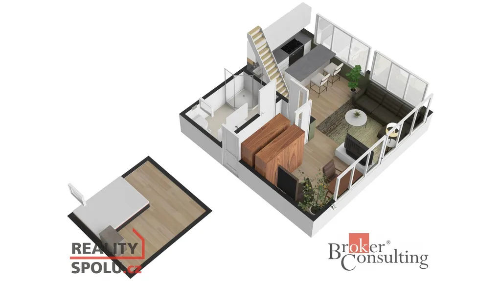Příjemným prvkem je možnost mezonetového spaní. Vytápění a ohřev vody zajišťují elektrokotel, infrapanely a radiátory.