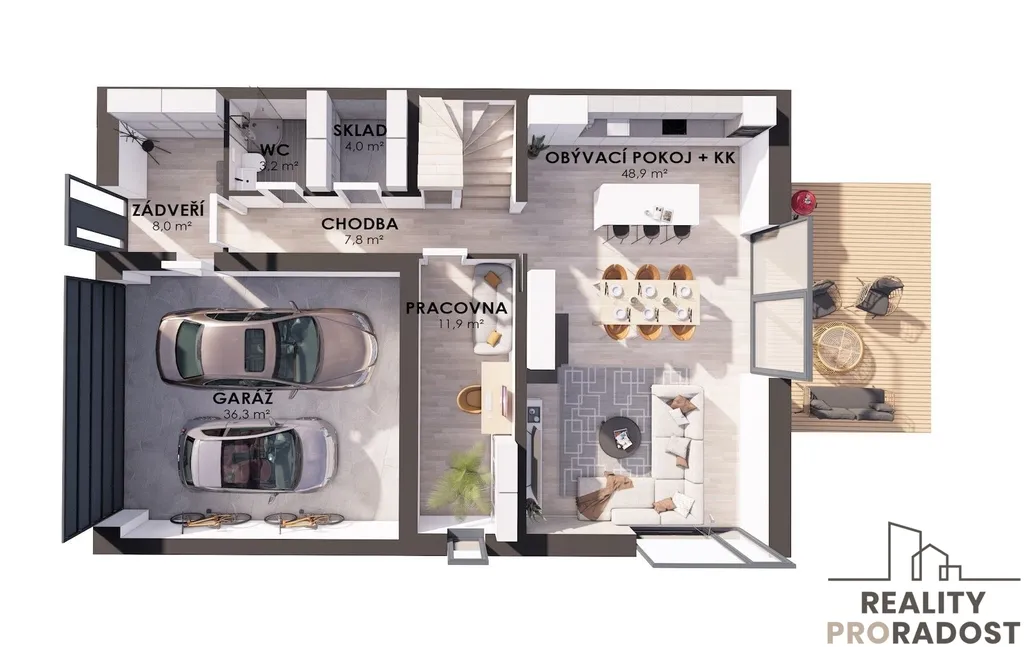 Obývací pokoj s kuchyní (49,9 m²), pracovna (11,9 m²), chodba (7,8 m²), technická místnost (4 m²), koupelna (3,2 m²), zádveří (8 m²) a dvojgaráž (36,3 m²).