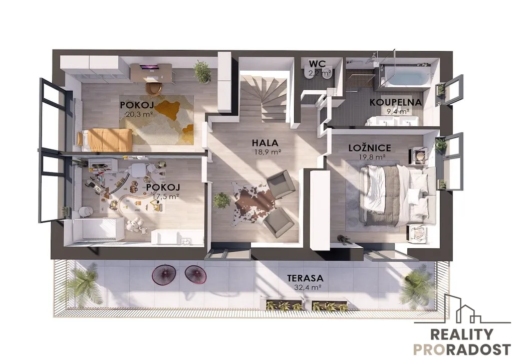 Ložnice (19,8 m²), pokoj (17,5 m²), pokoj (20,3 m²), hala (18,9 m²), koupelna (9,4 m²), WC (2,2 m²).