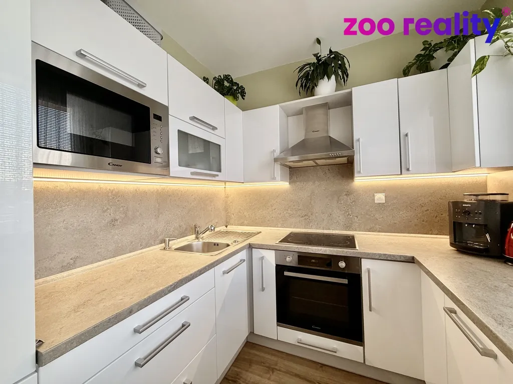 Najdeme zde vstupní předsíň se skříněmi, pokoj, opticky přepažený na obytnou a odpočinkovou část a další samostatný pokoj , zděné bytové jádro - samostatnou toaletu, koupelnu s vanou a prostorem pro pračku a kuchyni s kuchyňskou linkou vyrobenou na míru s vestavěnými spotřebiči ( MVT, trouba, myčka nádobí, indukční deska, stůl s barovými židlemi). K bytu patří další komora v mezi patře a sklepní kóje.