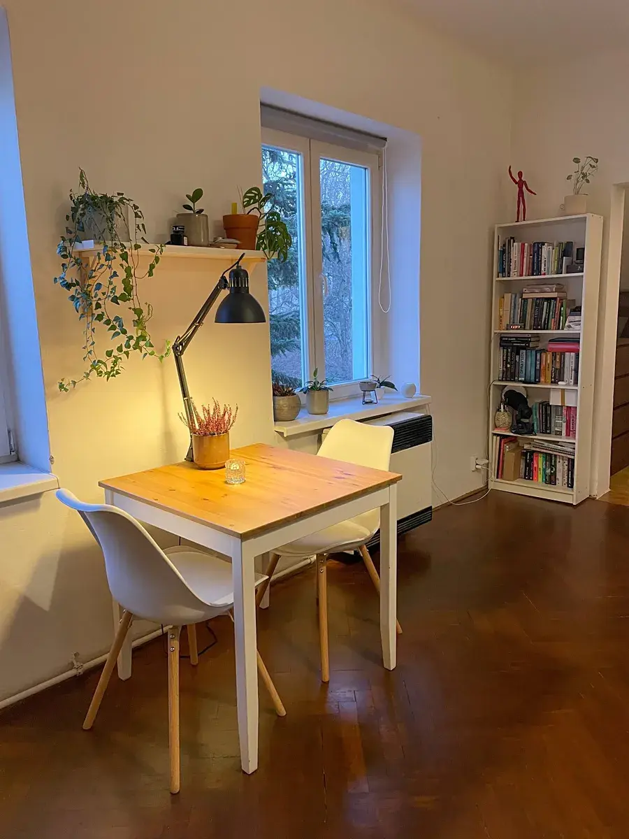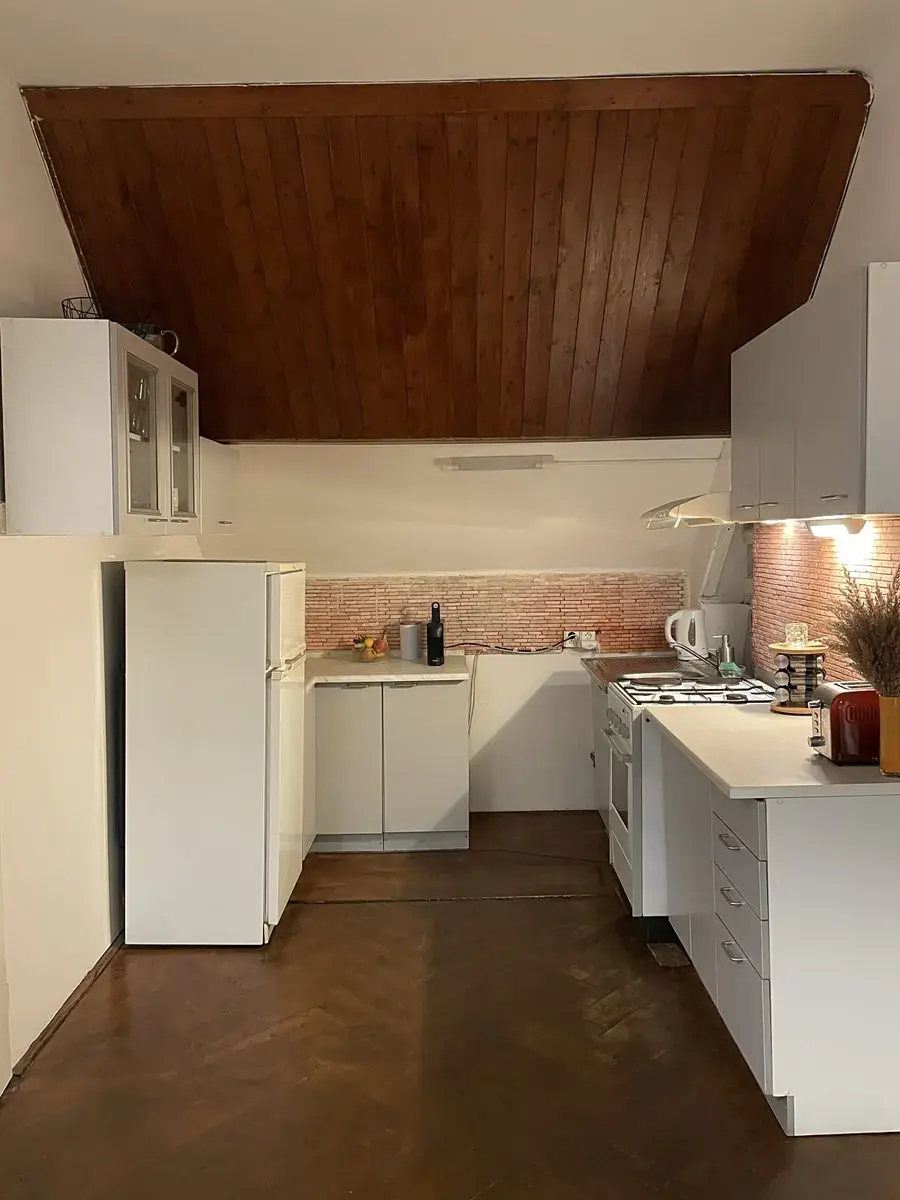 Z chodby (společná pro dva byty), kterou lze využít jako předsíň, se vchází do hlavní místnosti. Ta se člení na obývací část a kuchyňský sektor. Kuchyňský sektor je oddělen od obytné části jídelním stolem a židlemi. Vstup do koupelny se nachází na rozmezí kuchyně a obývací části. Koupelna s oknem je vybavena sprchovým koutem, WC a automatickou pračkou. Na protilehlé straně bytu je situován vstup do malé podkrovní ložnice s přiznanými trámy – viz foto. Nad bytem je vlastní půdní pokoj, možnost jako ateliér či odkládací prostor.