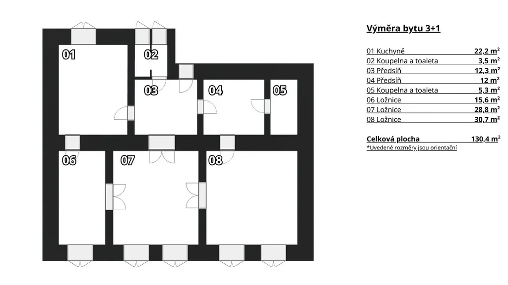 Stylový byt s vysokými stropy a dvoukřídlými dveřmi je situovaný v 1 N. P. a má celkovou užitnou plochu 130m². Nabízí se nezařízený. Je zde pouze kuchyňská linka, el. varná deska, el. trouba příslušenství koupelny a WC. V bytě jsou 2 koupelny s WC a 2 předsíně. Vzhledem ke specifické dispozice, mohou být všechny 3 pokoje neprůchozí, tudíž vhodné např. pro 3 páry. Velikost bytu a dispozice také umožňují zkombinovat bydlení s kanceláří.