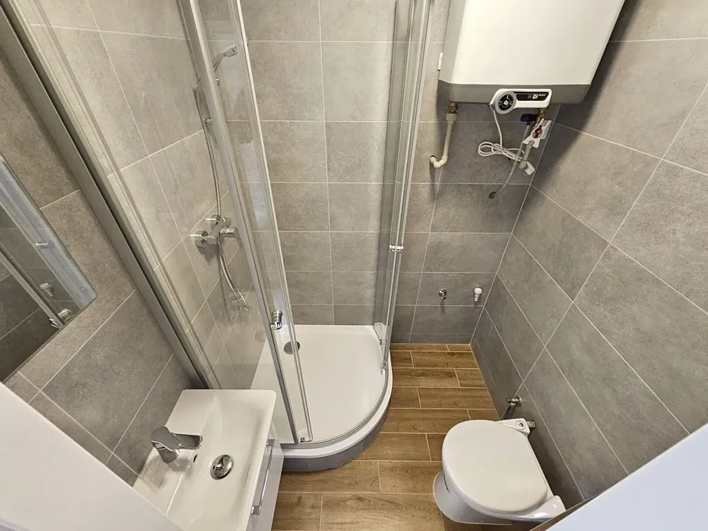 Je zde pokoj s kuchyňským koutem (linka, dřez, menší lednice, indukční vařič, mikrovlnná trouba) a koupelna se sprchovým koutem a s WC a s místem pro pračku s horním plněním.