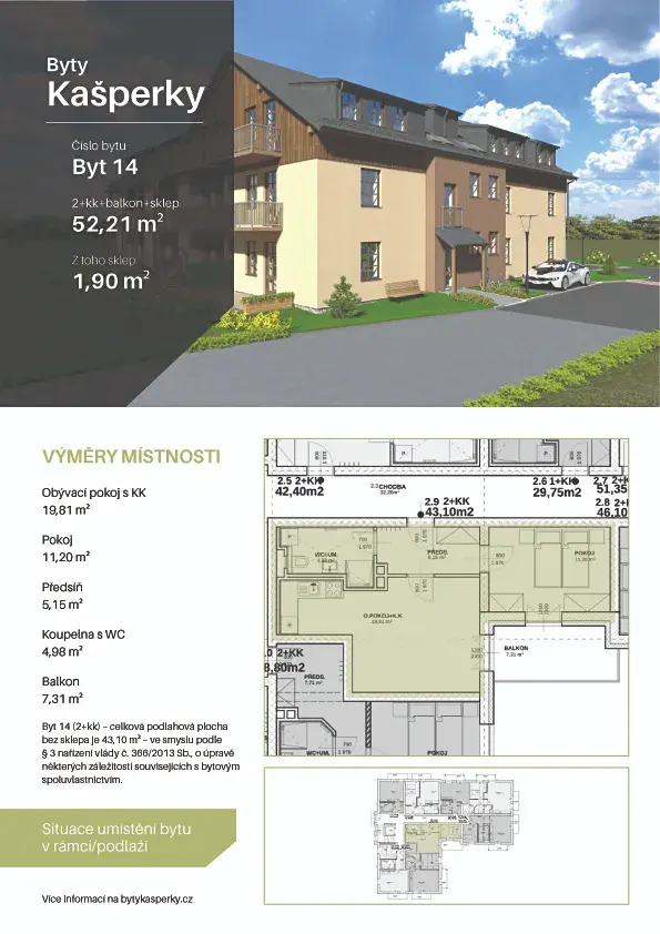 Nabízíme Vám k prodeji nový byt o velikosti 2+kk+balkon označený jako byt 14, nacházející se ve 2. NP o celkové ploše včetně balkonu a zděného sklepa 52,2 m2, který bude stavěn v rámci projektu Byty Kašperky ve velmi klidné části Kašperských Hor v České ul. s výhledem na okolní krajinu a přitom v docházkové vzdálenosti od centra Kašperských Hor.