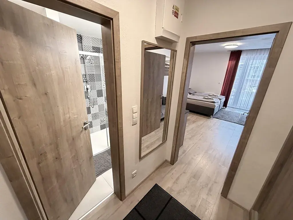 Vchodovými dveřmi vejdeme do vstupní chodby o výměře cca 4,3 m2, ve které se nachází po celé její délce vestavná skříň na míru se zabudovaným bojlerem pro ohřev teplé vody. Hlavní obytná část o výměře cca 21,8 m2 slouží jako kuchyně a obývací pokoj s ložnicí zároveň. Tato místnost je plně vybavena kuchyňskou linkou se čtyř plotýnkovou sklokeramickou deskou značky Elektrolux, digestoří, dřezem a lednicí s mrazákem. V pokoji je jídelní stůl se čtyřmi židlemi zajišťující komfortní stolování až čtyř osob. Nad stolem jsou dvě krásné designové lampy. V pokoji je dvojlůžko s nočními stolky a lampičkami, rozkládací gauč a nad gaučem se po žebříku dostaneme až do patrového jednolůžka. Naproti posteli je stěna s televizní skříňkou a televizí. Z obývacího pokoje je vstup na dominantu celého apartmánu, a to na terasu o výměře cca 21 m2, která slouží k relaxaci a odpočinku. Na terase je venkovní posezení, a to stůl se čtyřmi židlemi. Nesmíme opomenout dřevěný prvek na terase, který je posuvný a slouží k možnému zatemnění obytné místnosti. Nesmíme opomenout nádherný výhled do okolní přírody a na sousedící hory. Poslední místností v bytě je koupelna o výměře cca 3,5 m2, která disponuje velkým sprchovým koutem, WC, otopným žebříkem a umyvadlem se zrcadlem s umyvadlovou skříňkou. Koupelna je vybavena i vysoušečem vlasů.