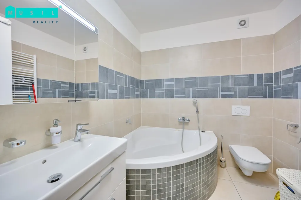 Byt disponuje dvěma koupelnami hlavní koupelna je vybavena vanou a WC, dále je k dispozici samostatné WC a druhá koupelna se sprchovým koutem, která je součástí hlavní ložnice, čímž vzniká komfortní rodičovský apartmán. Ke každému pokoji náleží vlastní terasa.