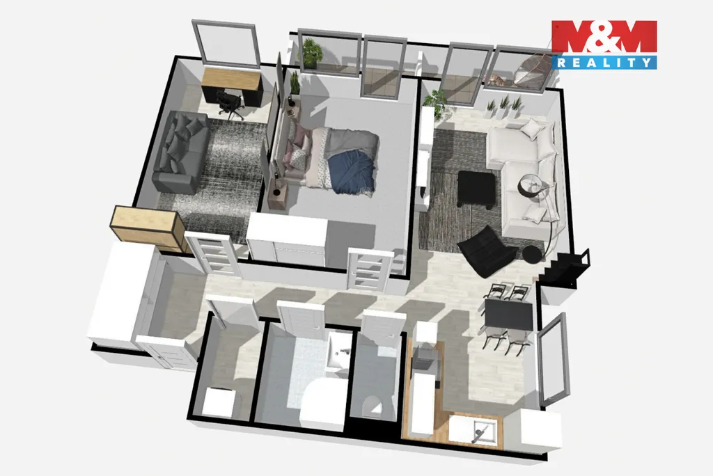 Samotný byt prošel rekonstrukcí v roce 2019 a nabízí moderní, útulné a praktické bydlení. Velkou předností jsou dva prosklené balkony, které byt krásně prosvětlují a poskytují nádherný výhled na Podměstský rybník – ideální místo pro ranní kávu i večerní relax.