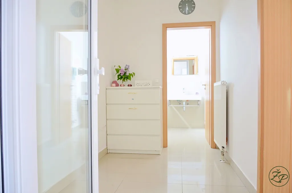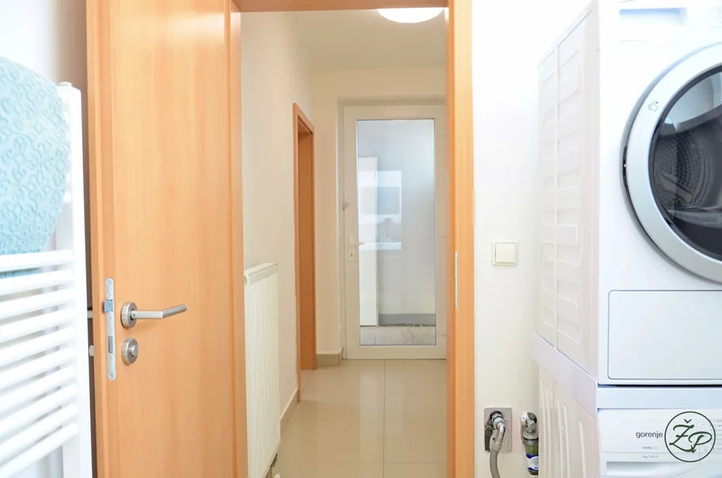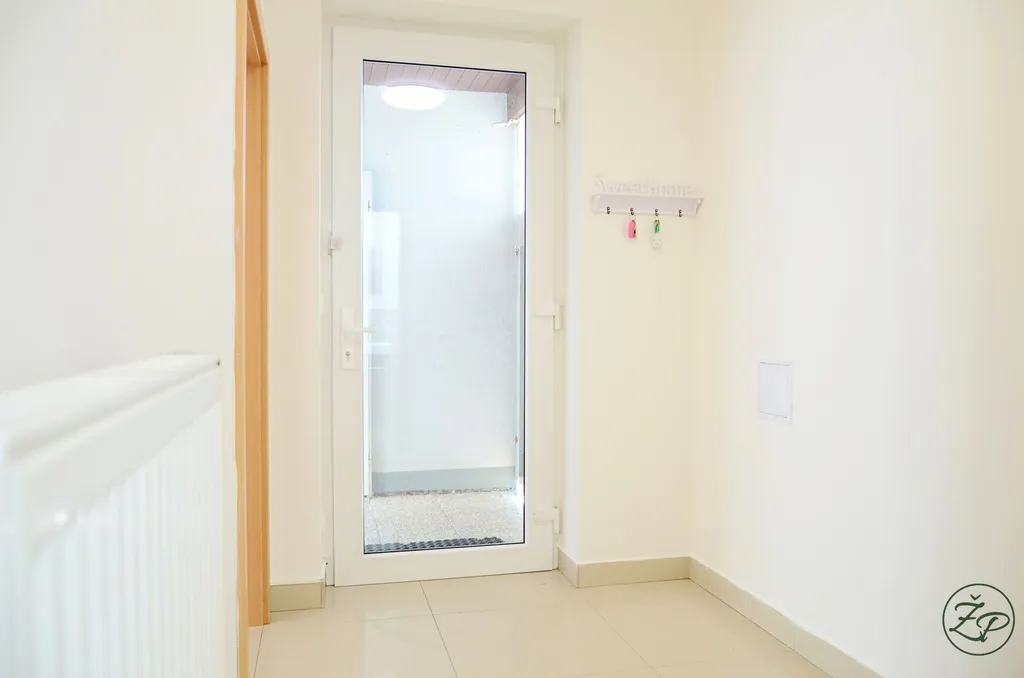 Dispozice: 1. NP (přízemí) = zádveří, jež vyúsťuje na terasu a zahradu; vstupní hala ze které je přístup na toaletu (vybavena pračkou a sušičkou); dále je z haly přístupný prostorný obývací pokoj (35.75m2), který je spojen s kuchyní, spižírnou a jídelnou. Kuchyně je nadstandardně vybavena těmito spotřebiči: Aquaphor – reverzní osmotický filtr pitné vody, indukční varná deska, digestoř, trouba, myčka nádobí, lednice s mrazničkou, mikrovlnná trouba. Z obývacího pokoje je 2x vstup na terasu a zahradu přes francouzské dveře.