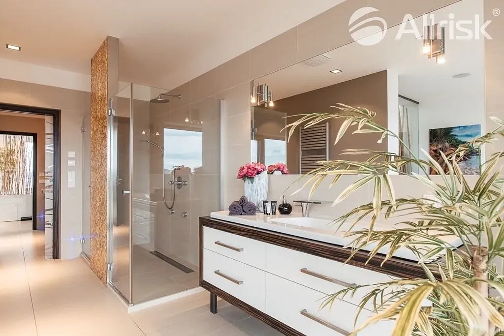 Relaxation features include a designer massage shower, a bathtub with landscape views, and a whirlpool under an artificial starry sky. A true rarity is the private outdoor saltwater pool on a green terrace – an exceptional feature rarely found in Brno.