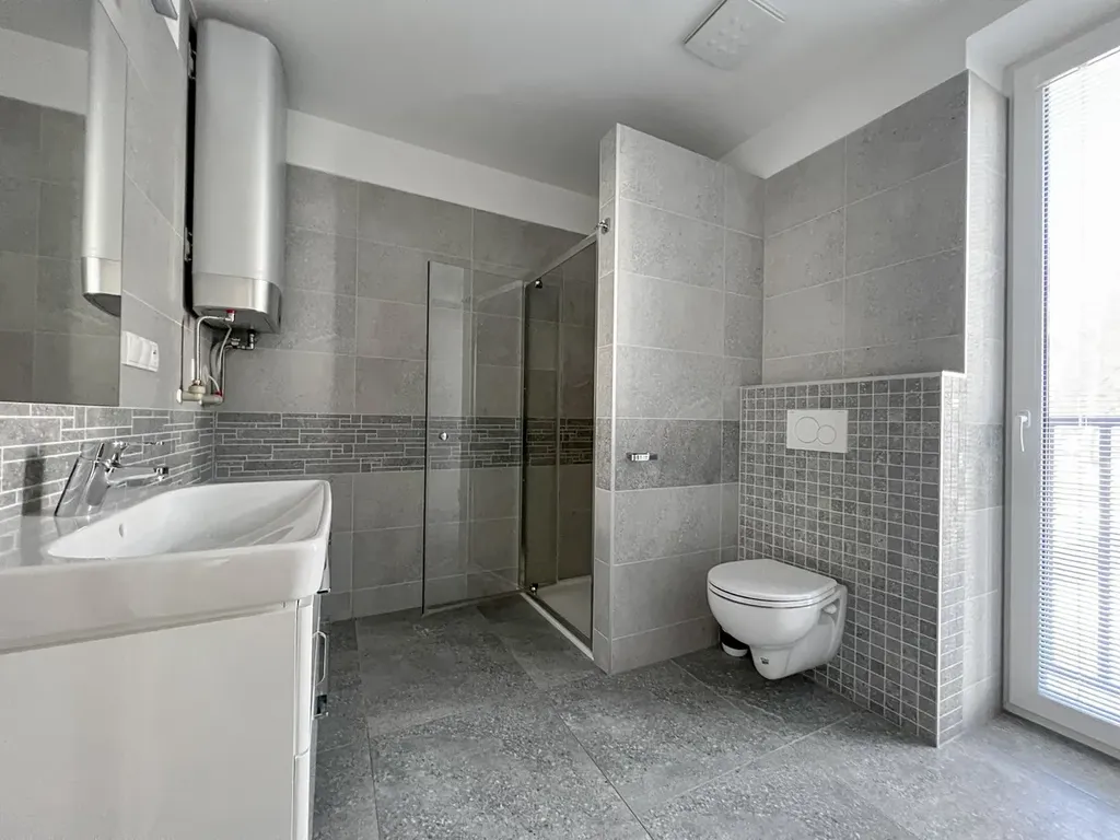 Komfort bydlení zvyšují venkovní elektrické žaluzie, které pomáhají s regulací světla i teploty, a v obývacím pokoji je navíc instalována klimatizační jednotka. V předsíni je k dispozici vestavěná věšáková skříň, která výrazně usnadní organizaci věcí a udrží byt přehledný. Součástí je koupelna se sprchovým koutem a WC; ohřev vody je řešen bojlerem umístěným v koupelně.