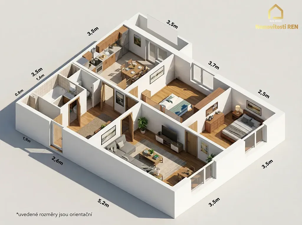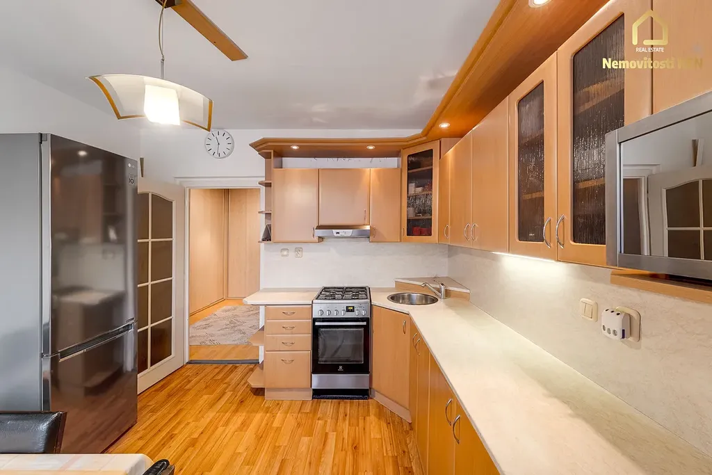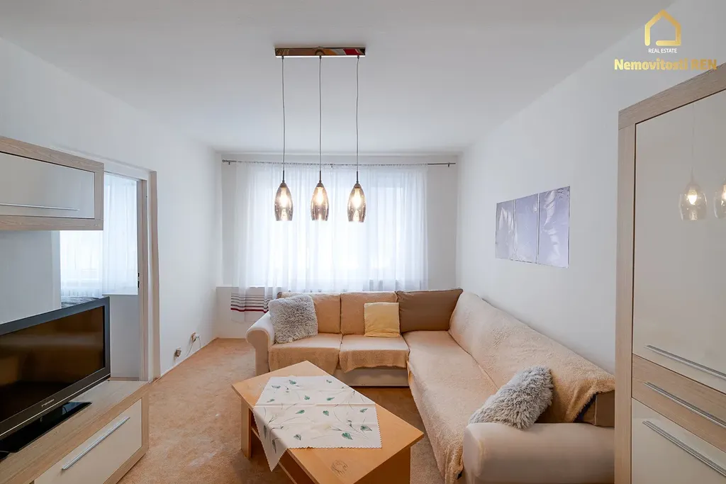Byt má velmi praktické dispoziční řešení. Dominantou je čtvercová chodba, ze které je samostatný vstup do kuchyně, pokoje a obývacího pokoje. Z obývacího pokoje se dále vstupuje do ložnice, což zajišťuje příjemné oddělení obytné a klidové části a nabízí pohodlné rodinné bydlení.