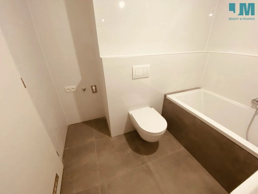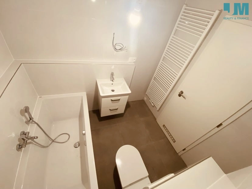Koupelna disponuje prostornou vanou, vestavnou toaletou, umyvadlem se skříňkou a zrcadlo s LED podsvícením.
