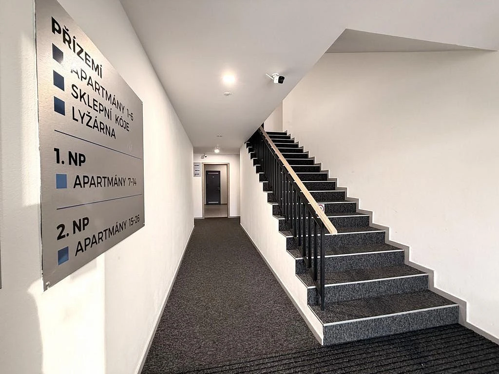 Součástí apartmánu je sklepní kóje o výměře cca 3,82 m² a vyhrazené venkovní parkovací stání.