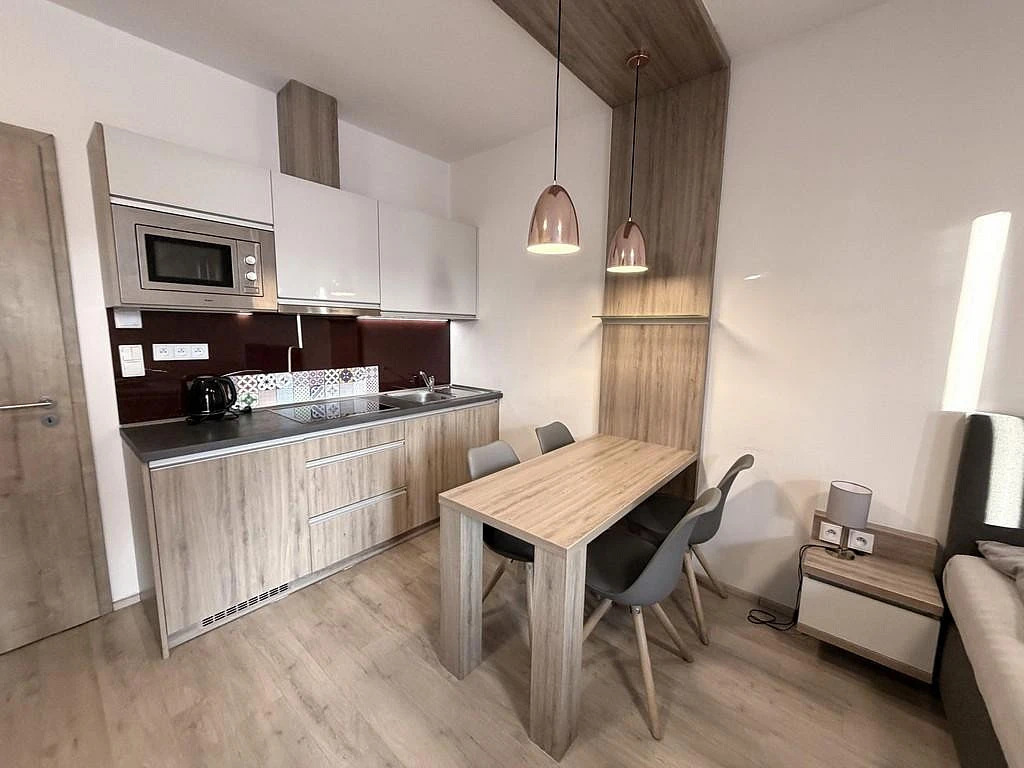Vchodovými dveřmi vejdeme do vstupní chodby o výměře cca 4,3 m², ve které se nachází po celé její délce vestavná skříň na míru se zabudovaným bojlerem pro ohřev teplé vody. Hlavní obytná část o výměře cca 21,8 m² slouží jako kuchyně a obývací pokoj s ložnicí zároveň. Tato místnost je plně vybavena kuchyňskou linkou se čtyř plotýnkovou sklokeramickou deskou značky Elektrolux, digestoří, dřezem a lednicí s mrazákem. V pokoji je jídelní stůl se čtyřmi židlemi zajišťující komfortní stolování až čtyř osob. Nad stolem jsou dvě krásné designové lampy. V pokoji je dvojlůžko s nočními stolky a lampičkami, rozkládací gauč a nad gaučem se po žebříku dostaneme až do patrového jednolůžka. Naproti posteli je stěna s televizní skříňkou a televizí. Z obývacího pokoje je vstup na dominantu celého apartmánu, a to na terasu o výměře cca 21 m², která slouží k relaxaci a odpočinku. Na terase je venkovní posezení, a to stůl se čtyřmi židlemi. Nesmíme opomenout dřevěný prvek na terase, který je posuvný a slouží k možnému zatemnění obytné místnosti. Nesmíme opomenout nádherný výhled do okolní přírody a na sousedící hory. Poslední místností v bytě je koupelna o výměře cca 3,5 m², která disponuje velkým sprchovým koutem, WC, otopným žebříkem a umyvadlem se zrcadlem s umyvadlovou skříňkou. Koupelna je vybavena i vysoušečem vlasů.