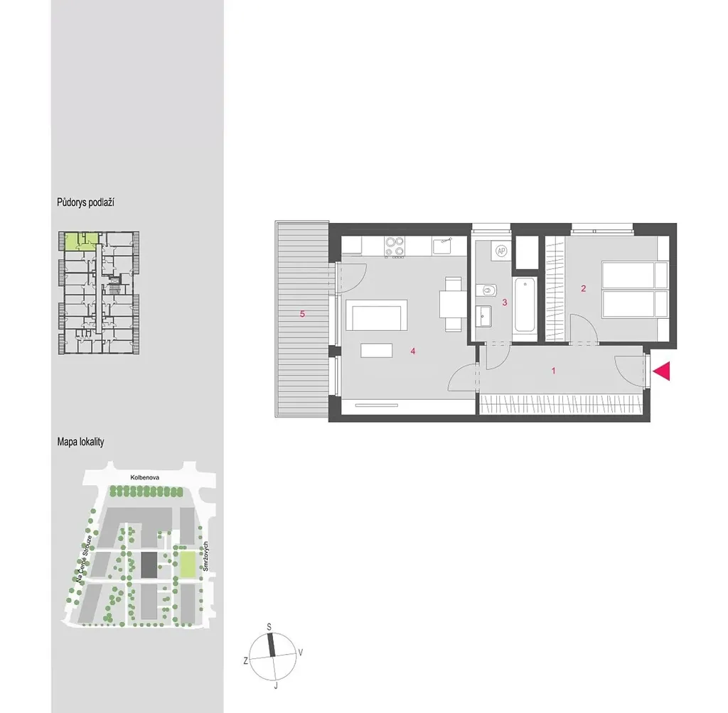 Byt o ploše 51 m² je umístěný ve 4. nadzemním podlaží. Je příjemně západně orientovaný, takže odpoledne krásně prosvětlený, zatímco ložnice na sever nabízí klidnější atmosféru a příjemnou teplotu pro spánek.