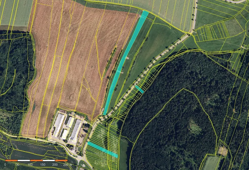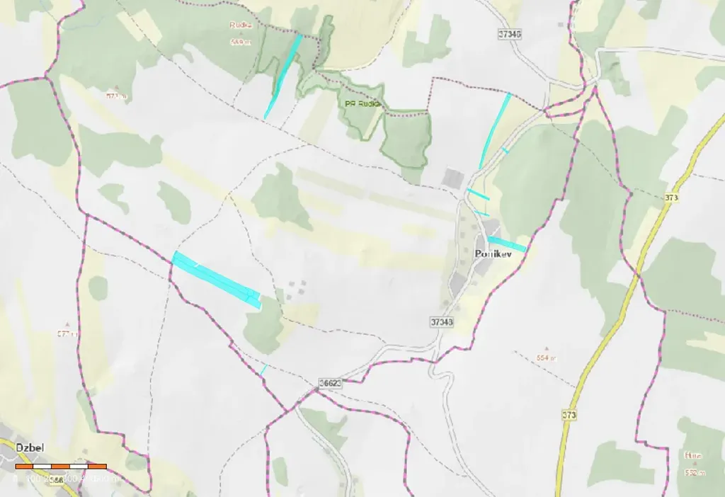 Ve funkčním celku s domem jsou pozemky parc.č. St. 43 o evidované výměře 794 m2, zastavěná plocha a nádvoří, součástí je stavba rod. domu Ponikev č.p. 15, parc.č. 57 o evidované výměře 2.515 m2, ovocný sad, parc.č. 58/7 o evidované výměře 209 m2, ostatní plocha, ostatní komunikace, parc.č. 895 o evidované výměře 90, trvalý travní porost, parc.č. 896/1 o evidované výměře 2.077 m2, trvalý travní porost a parc.č. 896/2 o evidované výměře 585, zahrada. Pozemky za stavbou tvořící jeden funkční celek jsou o celkové evidované výměře 6.270 m2. Ostatní pozemky jsou mimo funkční celek s domem. Jsou většinou zemědělského charakteru, na některých se nachází náletové porosty. Celková výměra těchto pozemků činí 51.916 m2. Část pozemků je užívána místním zemědělským družstvem. Pozemek p.č. 299 je lesním pozemkem o evidované výměře 4064 m2, způsob ochrany: chráněná ložisková území, pozemek určený k plnění funkcí lesa, přírodní rezervace. Nachází se v přírodní rezervaci Rudka.