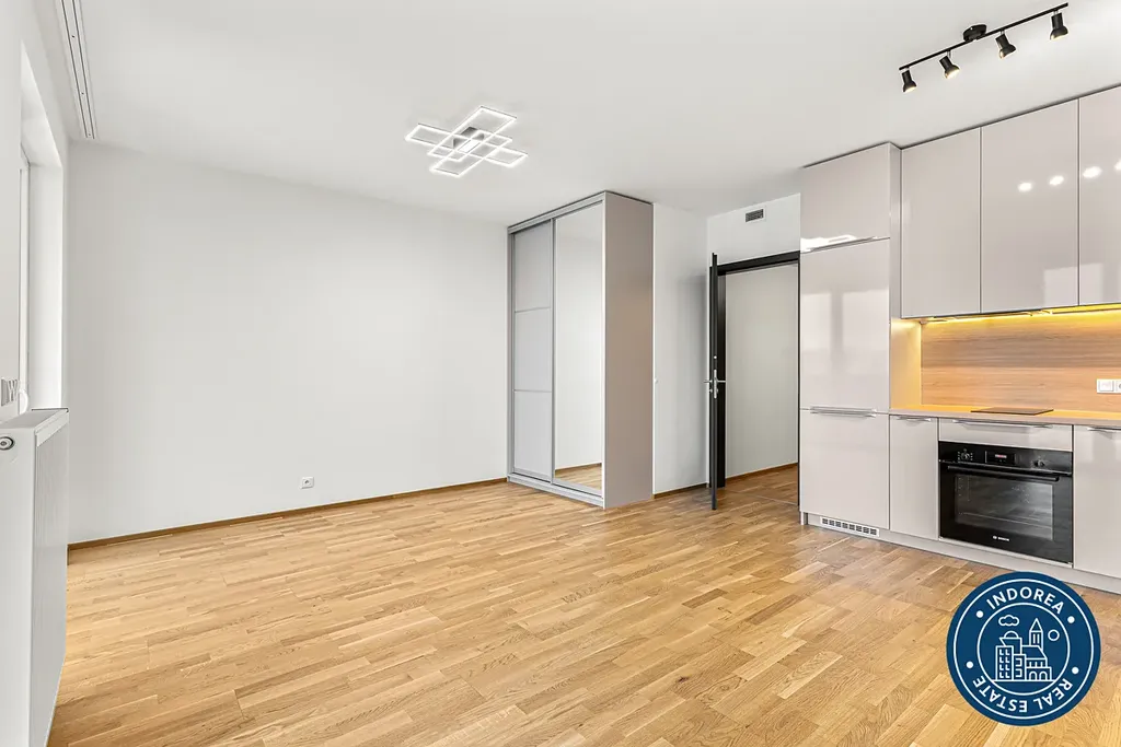 Tento zcela nový a zatím nikým neobývaný byt je částečně zařízen. Konkrétně tedy kuchyňská linka s vestavnými spotřebiči (myčka nádobí, trouba, varná deska, lednice), šatní skříň, koupelnový nábytek a automatická pračka.