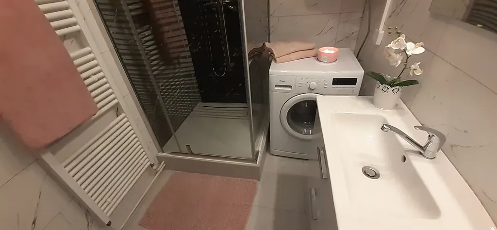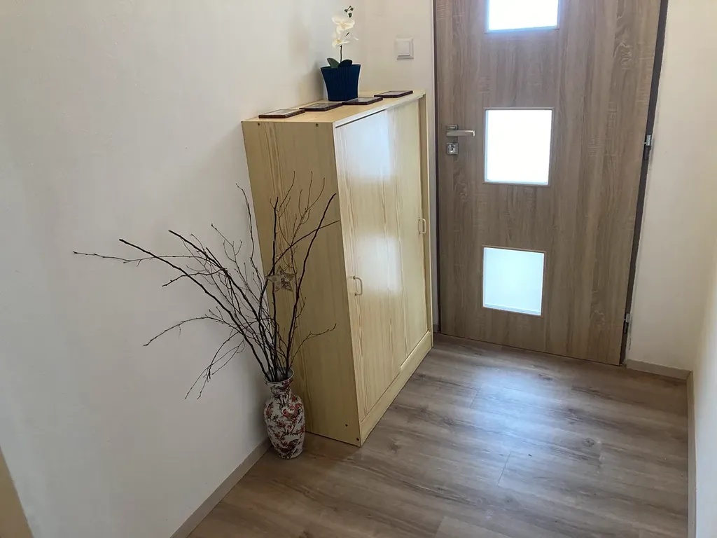 Z prostorné vstupní chodby ve tvaru „L“ – (zde je místo na uložení svršků, bot, deštníků a třeba i na sportovní věci) se dostanete do samostatné koupelny se sprchovým koutem a pračkou, na WC a dále do kuchyně a pokoje.