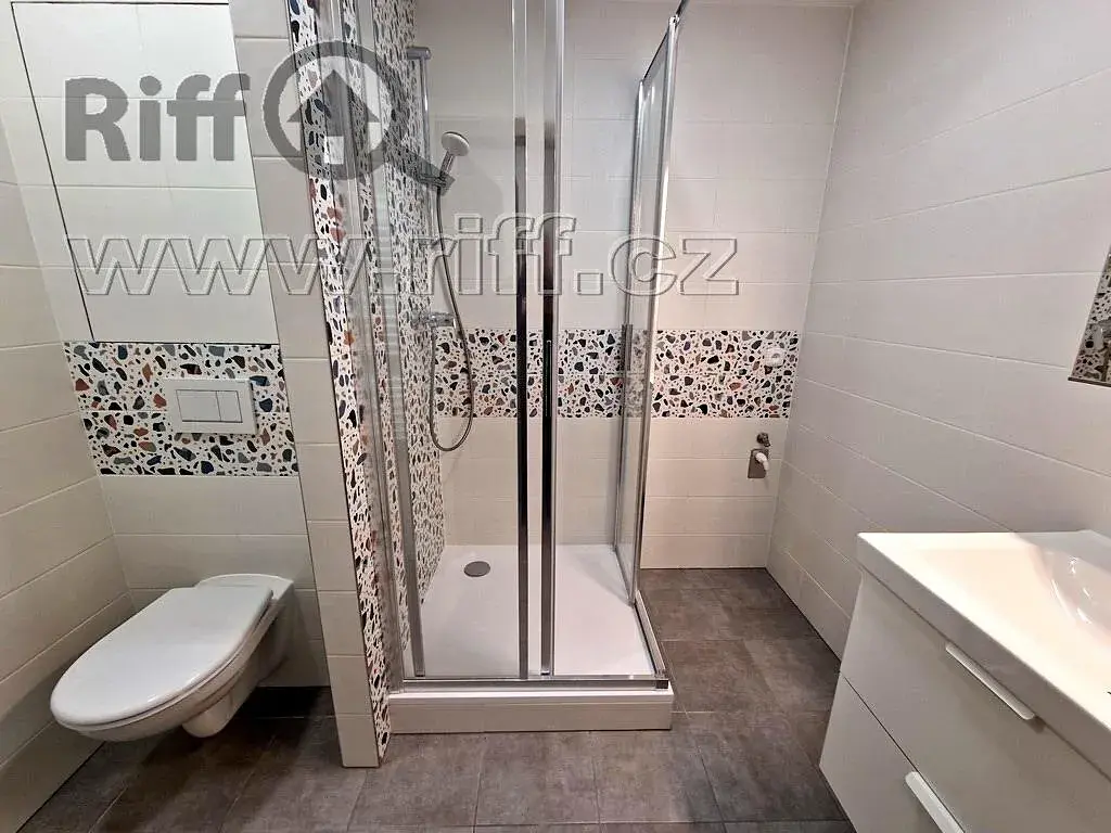 Koupelna je vybavena přípojkou na pračku, sprchovým koutem a WC. Podlahy tvoří dlažby (kuchyňský kout, koupelna a záchod) a kvalitní vinylová podlaha (pokoje, šatna a předsíň). Vytápění a ohřev teplé vody je zajištěn dálkově, v koupelně je topný žebřík.