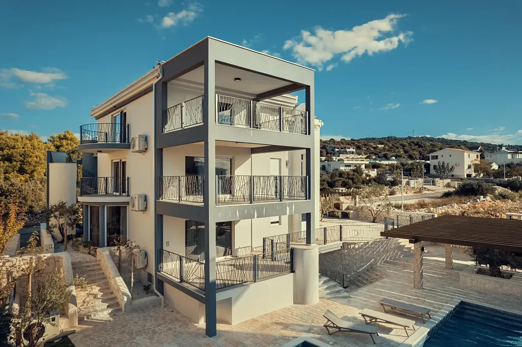 Představujeme místo, kde se snění o dokonalém bydlení u moře stává realitou. Představte si probouzet se každý den s nádherným výhledem na křišťálově čisté vody Jaderského moře v blízkosti oblázkových pláží, kde se točí život plný slunce, mořského vánku a pohody. Prostorné terasy nabízejí nezapomenutelné výhledy na moře a venkovní bazén s relaxační zónou je dokonalým místem pro osvěžení během horkých letních dnů. Objevte krásu a nezapomenutelné kouzlo dalmatského pobřeží a nalezněte své útočiště v jednom z moderně zařízených apartmánů pro svůj únik od každodenního života.