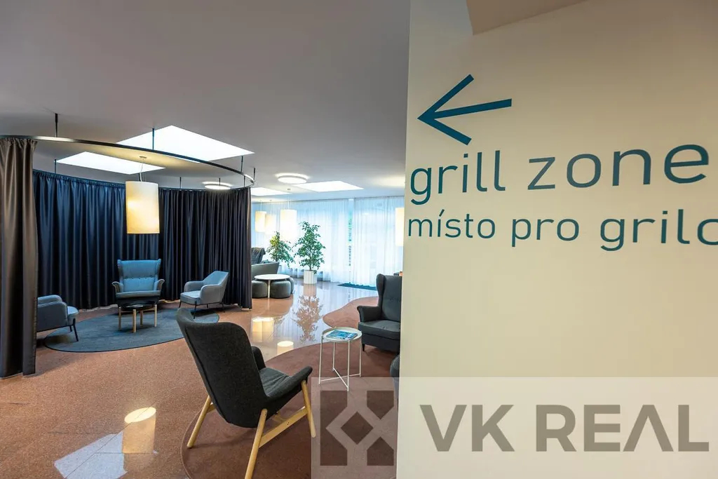 Vchod do nebytového prostoru je ze společné chodby v přízemí domu s 24 hodinovou recepcí. Skládá se z jedné místnosti (bez okna).