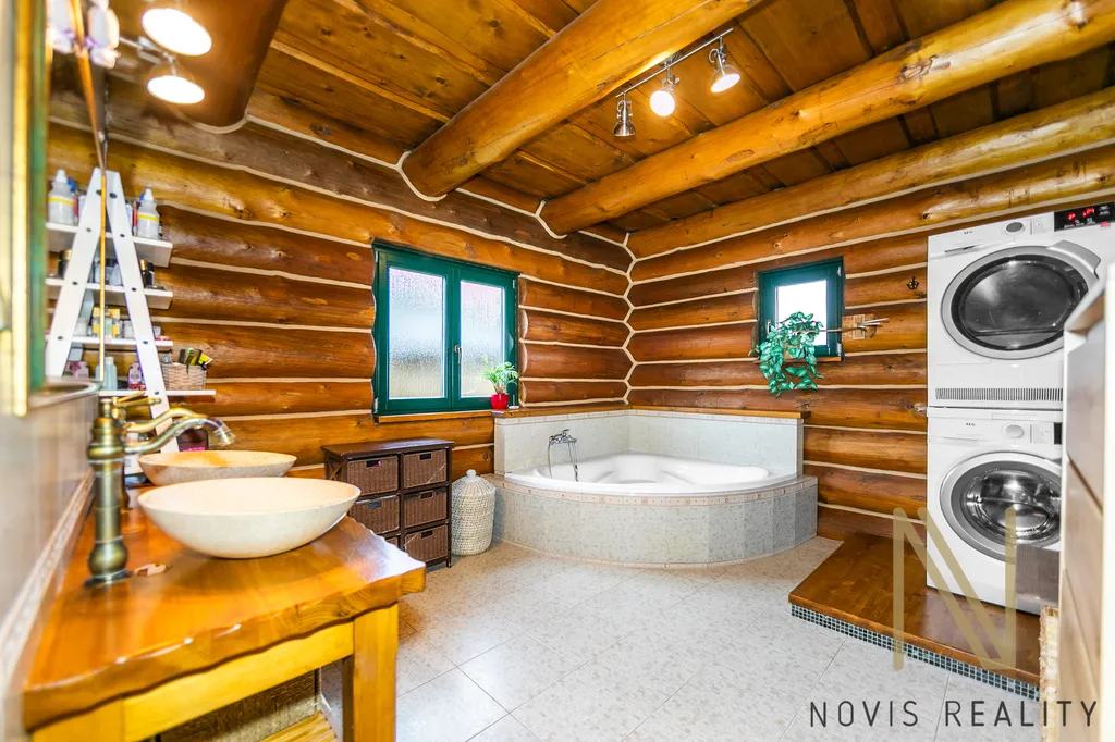 Vytápění a ohřev vody zajišťuje tepelné čerpadlo, v celém domě je podlahové vytápění a díky srubové konstrukci jsou provozní náklady dlouhodobě velmi nízké.