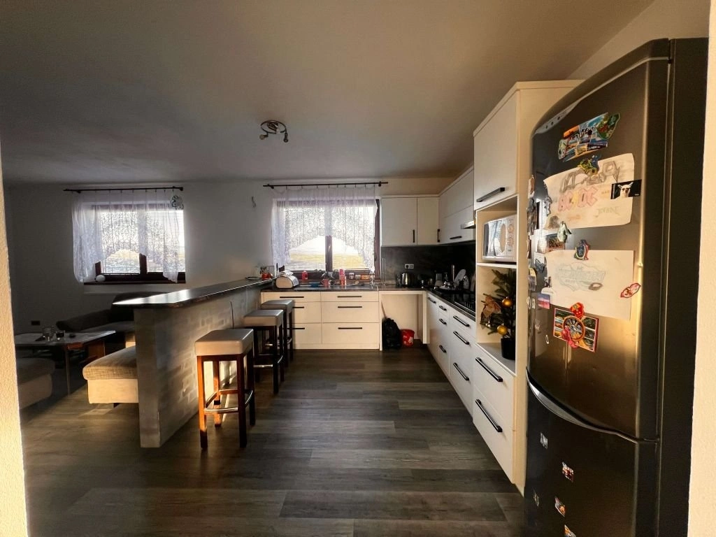 Jedná se o koncový řadový rodinný dům se 1.NP a provedenou vestavbou podkroví. V domě se nachází: v 1.NP: technická místnost – průjezd (11,90 m2), vstup (6,60 m2), koupelna s WC (6,44 m2), obývací pokoj s kk (37,10 m2), schodiště (4,45 m2) a dále v podkroví a zastřešení: chodba (11,65 m2), WC (1,82 m2), koupelna – nedokončená (6,61 m2), pokoj (14,83 m2), pokoj se šatnou (22,55 m2) a pokoj (10,58 m2). Podlaha je keramická a plovoucí vinyl a laminát, schodiště je betonové, okna dřevěná Eurookna. Vytápění je etážové napojené na krbovou vložku s výměníkem. Dům je napojen na přívod elektrické energie, přípojkou na vlastní studnu, na místní kanalizaci a na zemní plyn.