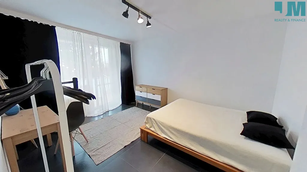 V bytě se dále nachází vzdušný pokoj s postelí, skříňkou a vstupem na balkón.